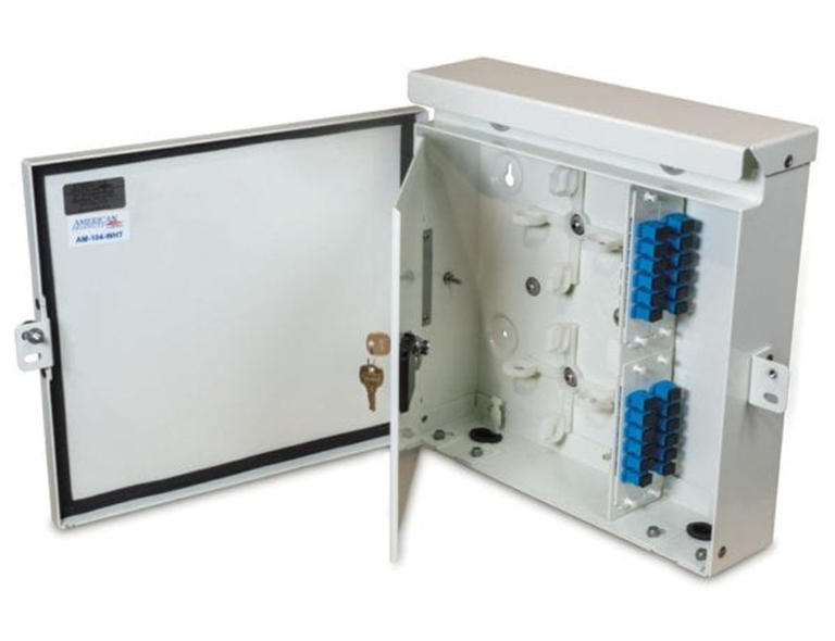 The AM-50-SDC cabinet is built to transition outdoor-rated fiber cable to indoor-rated cable, accommodating up to 12 splice trays and storing up to 75 feet of fiber.